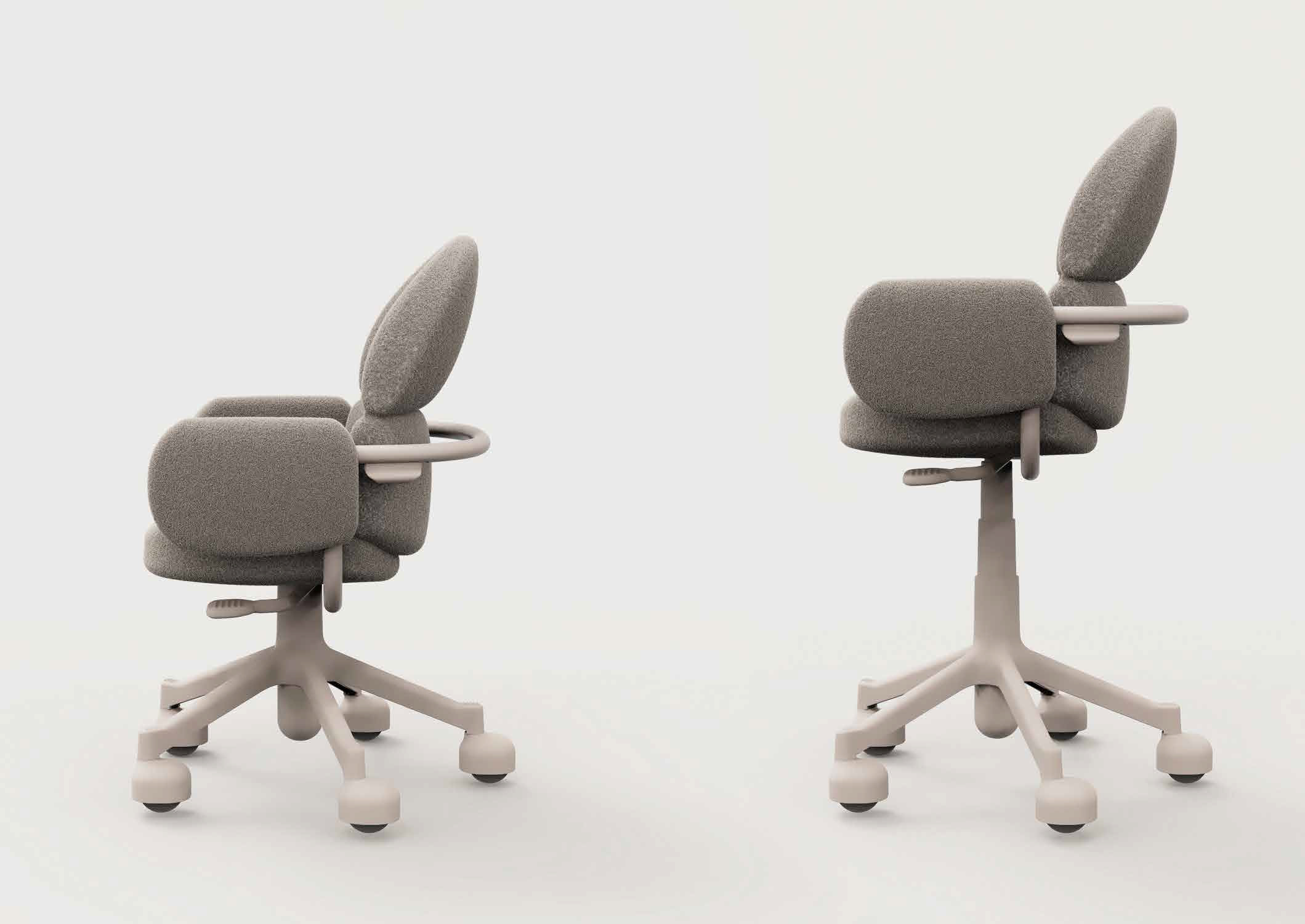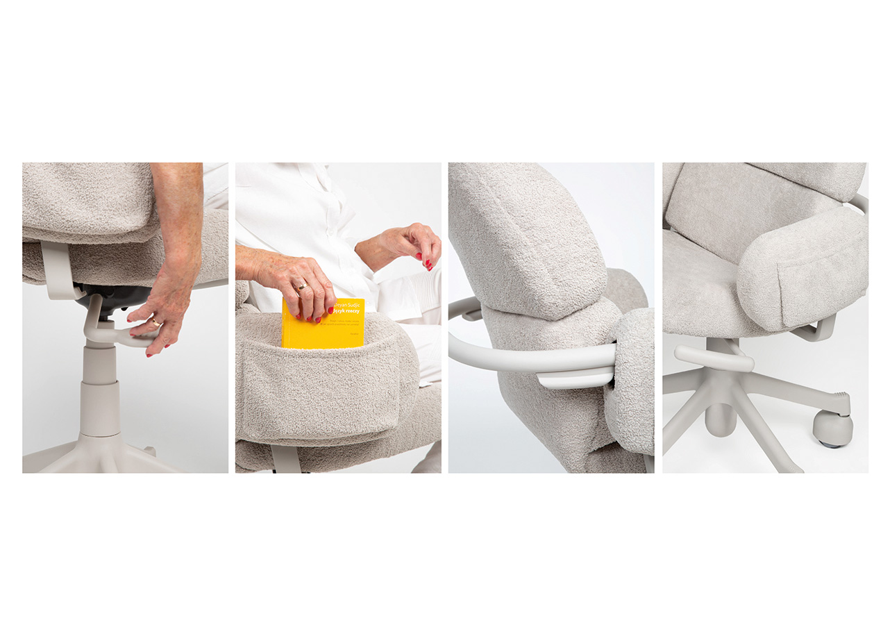 Projekt fotela ma na celu wydłużenie okresu samodzielności seniorów z ograniczeniami kończyn dolnych w warunkach domowych. Jest przeznaczony dla osób starszych potrzebujących wsparcia w codziennym funkcjonowaniu, dla których tradycyjny wózek inwalidzki okazuje się niedostosowany do mieszkań. Do najczęstszych problemów należą: blokowanie się wózka między meblami, niekomfortowa wysokość blatów kuchennych czy brak możliwości dosięgnięcia do górnych półek – wszystko to ogranicza niezależność i obniża komfort życia. Fotel wyposażono w regulację wysokości w zakresie 45–70 cm, co pozwala na przyjmowanie zarówno pozycji półstojącej, jak i standardowej siedzącej. Jego konstrukcja oparta jest na pięcioramiennej podstawie z kółkami wyposażonymi w hamulce. Z tyłu znajduje się uchwyt pełniący funkcję balkonika, a przesuwne podłokietniki ułatwiają przesiadanie się, np. na łóżko. Mechanizmy regulacji zostały ukryte w konstrukcji, dzięki czemu całość zachowuje domowy, meblowy charakter. Projekt ten zapewnia inkluzywność poprzez dyskretne wsparcie techniczne, wzmacniając niezależność użytkownika i podtrzymując jego poczucie godności.