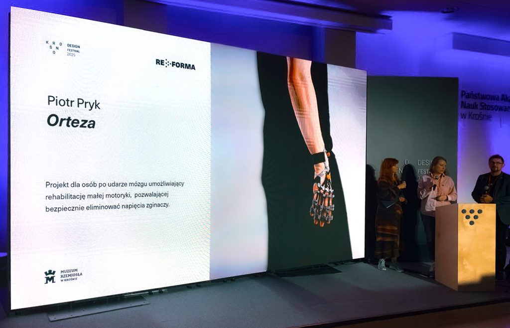Projekt ortezy dla osób po udarze mózgu, autorstwa Piotra Pryka, zrealizowany w Pracowni Ergonomii pod kierunkiem prof. Czesławy Frejlich i mgr Karola Cyrulika, został wyróżniony w konkursie RE:Forma 2025 podczas Krosno Design Festival.